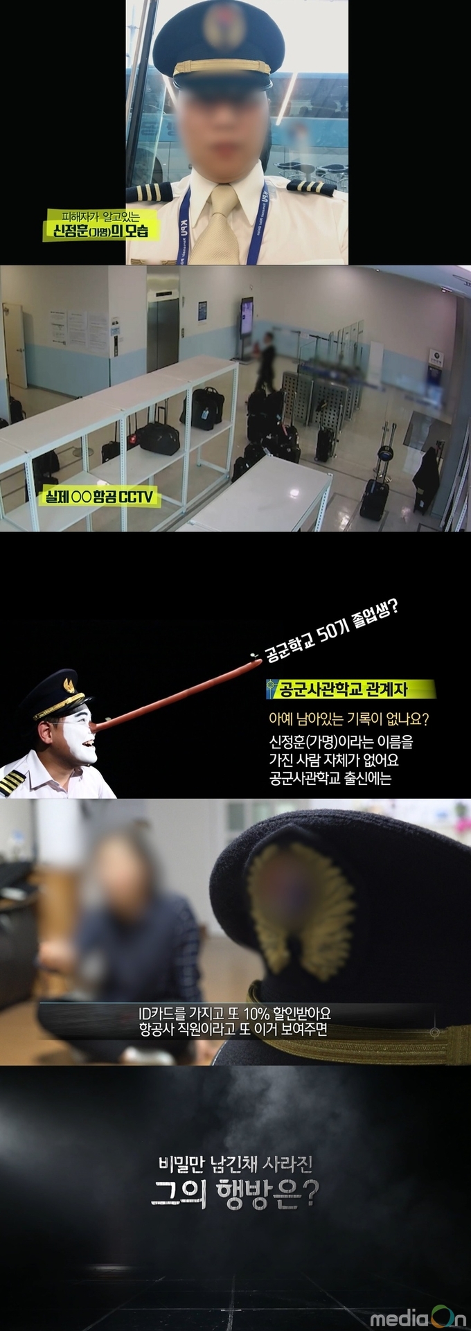 사람들에게 자신을 항공사 부기장이라고 소개하는 신 씨. 비행을 다녀오면 잊지 않고 선물을 사 오는 섬세함까지 갖춘 그를 만난 여자들은 모두 마음을 빼앗겼다. 제복을 입고 항공사 직원 출입카드로 자유롭게 공항 내부를 드나들며 어려운 비행용어까지 술술 읊었던 남자. 그는 승진을 위한 로비 자금이 필요하다며 돈을 요구했고, 사람들은 평소 쌓아왔던 신뢰를 바탕으로 돈을 빌려주었지만 남자는 돈을 가지고 잠적해버렸다.