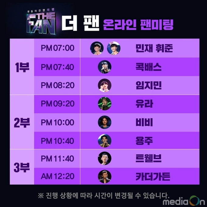 지난 18일 ‘더 팬’ 4라운드에 진출한 민재휘준, 콕배스, 임지민, 유라, 비비, 용주, 트웰브, 카더가든은 온라인 팬미팅을 통해 팬들을 만났다. 최근 진행했던 첫 팬미팅에 아쉽게 오지 못한 많은 팬들을 위해 특별한 이벤트를 마련한 것. 이번 온라인 팬미팅에서 예비스타들은 팬들이 궁금해하는 것들에 대해 답하며 실시간으로 소통하는 시간을 가졌디.