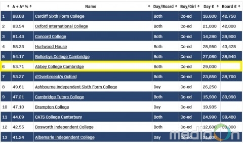 올해 Abbey College Cambridge는 Independent 6th Form Colleges by A Level에서 6위를 차지했으며, A+A* 53.71%의 높은 등급을 받았다.