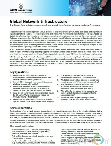MTN Consulting, LLC는 "Global Network Infrastructure - Subscription Service: Tracking Global Markets for Communications Network Infrastructure Hardware, Software & Services"라는 연간구독 형태의 정보서비스를 제공한다.