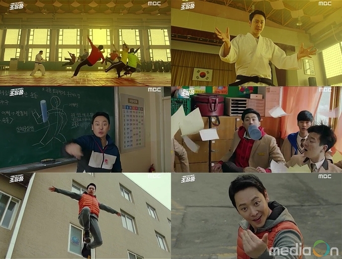 극중 과거 유도선수 출신 체육교사였던 김동욱은 엄청난 괴력의 장풍으로 불량학생 훈계에 나서는가 하면 자신의 별명대로 장풍을 일으키며 분필을 투척해 수업분위기를 헤치는 학생을 제압하기도 했다. 이밖에 하늘을 날 듯 창문에서 뛰어내려 극중 문제 학생인 김경남(천덕구 역)의 뒤를 쫓는 장면이 전파를 타 시청자들의 시선을 단숨에 사로 잡았다.